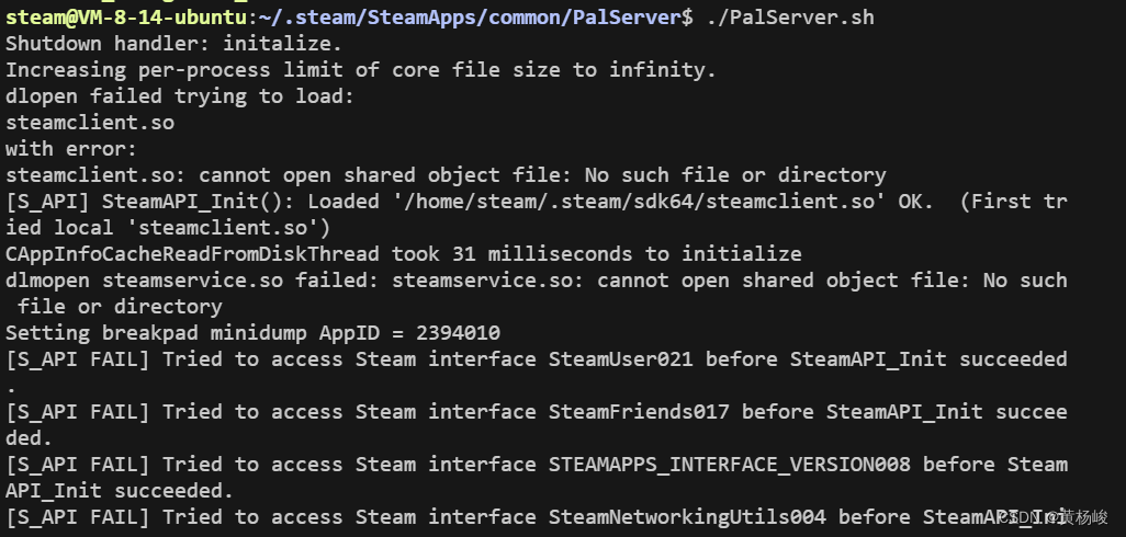 服务ini配置修改【非必需步骤】steamcmd安装完后,运行路径可能是~/.steam,也可能是~/Steam,可以在/home/steam目录下执行ls -a,确定是否有.steam或者Steam文件夹。如果安装目录是Steam文件夹,把下面的.steam换成Steam。 启动PalServer前可以修改一下配置文件,可以把默认的配置文件DefaultPalWorldSettings.ini 拷贝一份,重命名为 PalWorldSettings.ini,然后手动修改里面的内容,用vim修改内容。 cd ~/.steam/SteamApps/common/PalServercp ./DefaultPalWorldSettings.ini Pal/Saved/Config/LinuxServer/PalWorldSettings.inivim Pal/Saved/Config/LinuxServer/PalWorldSettings.ini 启动PalServer下一步就是进入palserver的目录中,然后执行以下命令 cd ~/.steammkdir sdk64cd ~/.steam/SteamApps/common/PalServercp linux64/* ~/.steam/sdk64 最后就是启动服务器的脚本 cd ~/.steam/SteamApps/common/PalServer ./PalServer.sh 可以看到,一切运行正常。